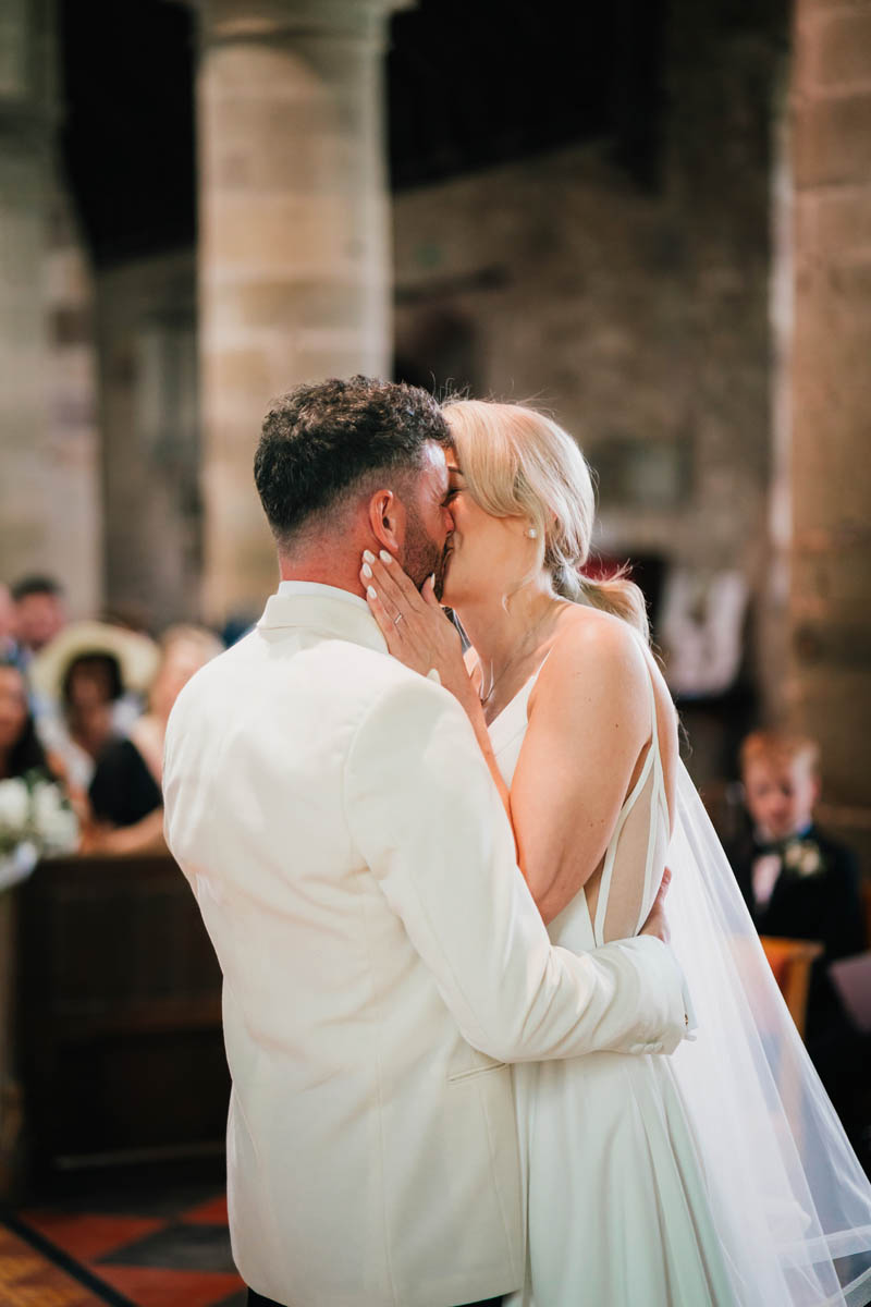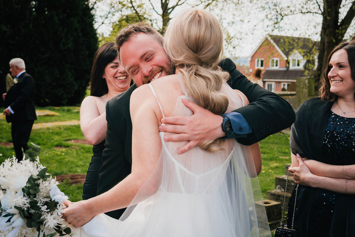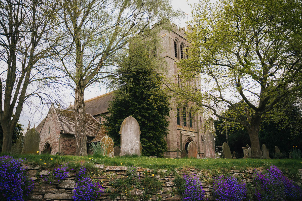 Before long, her bridesmaids turned up, and together the bridal party made the short walk across the road to Madley Church. Inside, the ceremony felt warm and personal, with a vicar who created a joyful, relaxed atmosphere for the couple to exchange vows. After signing the register, Lindsay and Shay paused for a private moment tucked around the side of the church whilst I organised guests outside, ready with confetti. The newlyweds re-emerged through the main doors into a joyful tunnel of colour, followed by hugs, congratulations and a handful of relaxed group photographs in the main church door.