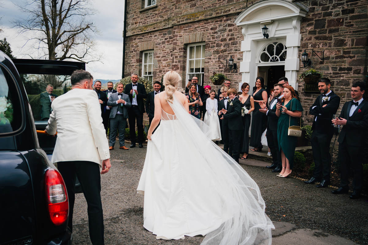 The couple travelled to Peterstone Court in a classic London black cab carrying them through the beautiful countryside past Brecon and into the Brecon Beacons. Being a chilly April day, the drinks reception took place inside the house and felt cosy and lively. Fortunately, it wasn’t raining, so we stepped outside to make the most of Peterstone Court’s stunning views and landscaped gardens for portraits, the mountains providing a stunning backdrop.